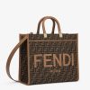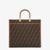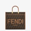 Medium Sunshine Shopper bag made of fabric with brown FF jacquard motif and “FENDI ROMA” lettering in light brown leather and stiff leather handles. Features a spacious lined internal compartment, light brown leather edging and gold-finish metalware. Can be carried by hand with the two handles, and two inner hooks allow you to attach a shoulder strap.