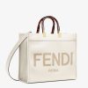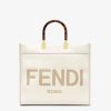 Medium Sunshine Shopper bag made of white leather with hot-stamped “FENDI ROMA” and stiff tortoiseshell plexiglass handles.