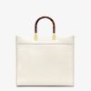 Medium Sunshine Shopper bag made of white leather with hot-stamped “FENDI ROMA” and stiff tortoiseshell plexiglass handles. Equipped with a spacious lined internal compartment, edges in tone on tone leather, and gold-finish metalware. Can be carried by hand or worn on the shoulder thanks to the two handles and detachable shoulder strap.