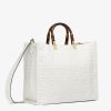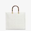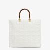 Medium Sunshine Shopper bag made of white leather with raised 3D-texture FF motif and rigid tortoiseshell-effect plexiglass handles. Features a spacious lined internal compartment, edges in tone on tone leather, and gold-finish metalware. Can be carried by hand or worn on the shoulder thanks to the two handles and detachable shoulder strap.