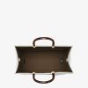 Features a spacious lined internal compartment, edges in tone on tone leather, and gold-finish metalware.