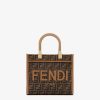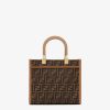 Small Sunshine bag, a roomy, versatile city shopper that stands out thanks to its linear design and sophisticated details. Made of jacquard fabric with the iconic FF motif in brown, with “Fendi Roma” lettering appliqué in beige leather. Stiff beige leather handles. Features a spacious lined internal compartment, edges in tone-on-tone leather, and gold-finish metalware. The bag can be carried by hand with the two handles, or worn either on the shoulder or cross-body with the adjustable, detachable shoulder strap.