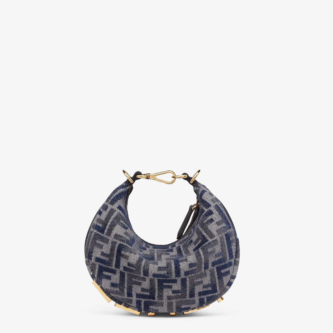 Mini hobo bag made of soft, light blue leather, embellished with vintage gold metal FENDI lettering. Zip closure with fabric-lined internal compartment, gold-finish metalware. It can be carried by hand thanks to the hook and clip to use as a handle, or worn cross-body using the thin, adjustable, detachable shoulder strap.