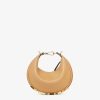 Mini Fendigraphy hobo bag with a contemporary look and bold details. Made of beige calfskin, decorated with vintage gold-finish metal FENDI lettering on the base, visible when the bag is worn. Zipper closure with fabric-lined internal compartment, gold-finish metalware. It can be carried by hand by closing the bag with the clip, or worn on the shoulder or cross-body using the adjustable, detachable shoulder strap inserted inside the side attachment points. Holds a 6.2-inch smartphone, Mini Trifold card holder or wallet, keys and lipstick.
