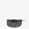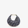 Mini Fendigraphy hobo bag with a contemporary look and bold details. Made of chenille with the iconic FF motif in dark blue, decorated with vintage gold-finish metal FENDI lettering on the base, visible when the bag is worn. Zip fastening and fabric-lined internal compartment, dark blue calfskin details and gold-finish metalware. It can be carried by hand by closing the bag with the clip or worn on the shoulder or cross-body using the adjustable, detachable shoulder strap inserted inside the side attachment points. Holds a 6.2-inch smartphone, Mini Trifold card holder or wallet, keys and lipstick.