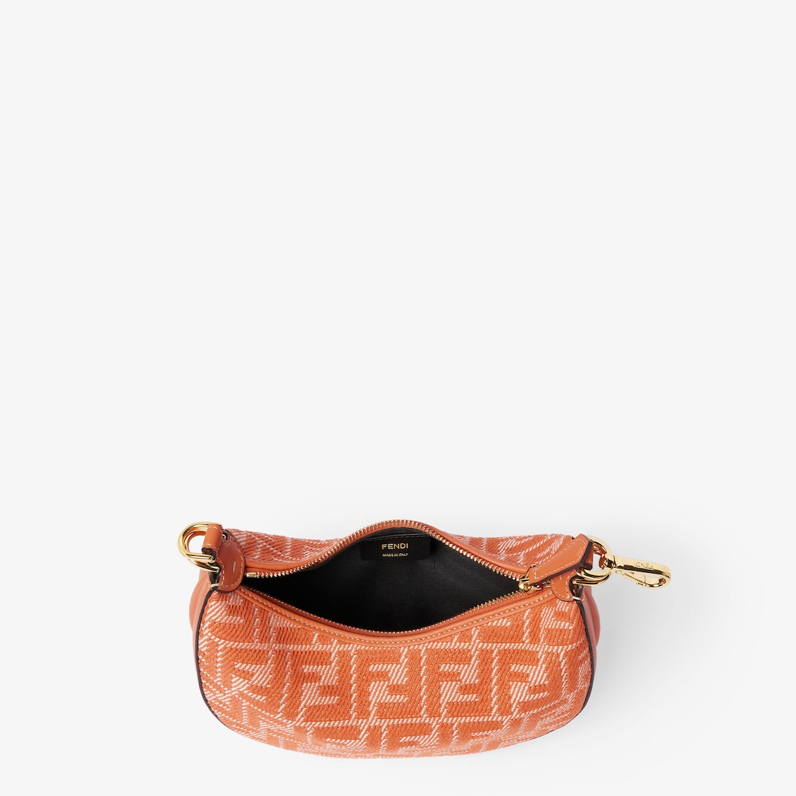 Mini Fendigraphy hobo bag with a contemporary look and bold details. Made of denim-effect FF jacquard in shades of orange, decorated with vintage gold metal FENDI lettering on the base, visible when the bag is worn. Zipper closure with a lined internal compartment, gold-finish metalware. It can be carried by hand by closing the bag with the clip or worn on the shoulder or cross-body using the adjustable, detachable orange leather shoulder strap inserted inside the side attachment points. Holds a 6.2-inch smartphone, Mini Trifold card holder or wallet, keys and lipstick.