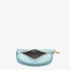Mini Fendigraphy hobo bag with a contemporary look and bold details. Made of light blue calfskin, decorated with vintage gold-finish metal FENDI lettering on the base, visible when the bag is worn. Zipper closure with fabric-lined internal compartment, gold-finish metalware. It can be carried by hand by closing the bag with the clip, or worn on the shoulder or cross-body using the adjustable, detachable shoulder strap inserted inside the side attachment points. Holds a 6.2-inch smartphone, Mini Trifold card holder or wallet, keys and lipstick.