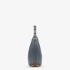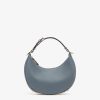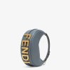 Small hobo bag made of soft, blue leather, decorated with vintage gold metal FENDI lettering visible when wearing the bag under the arm.
