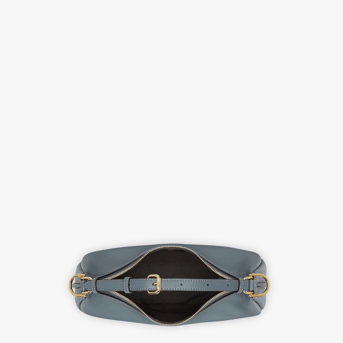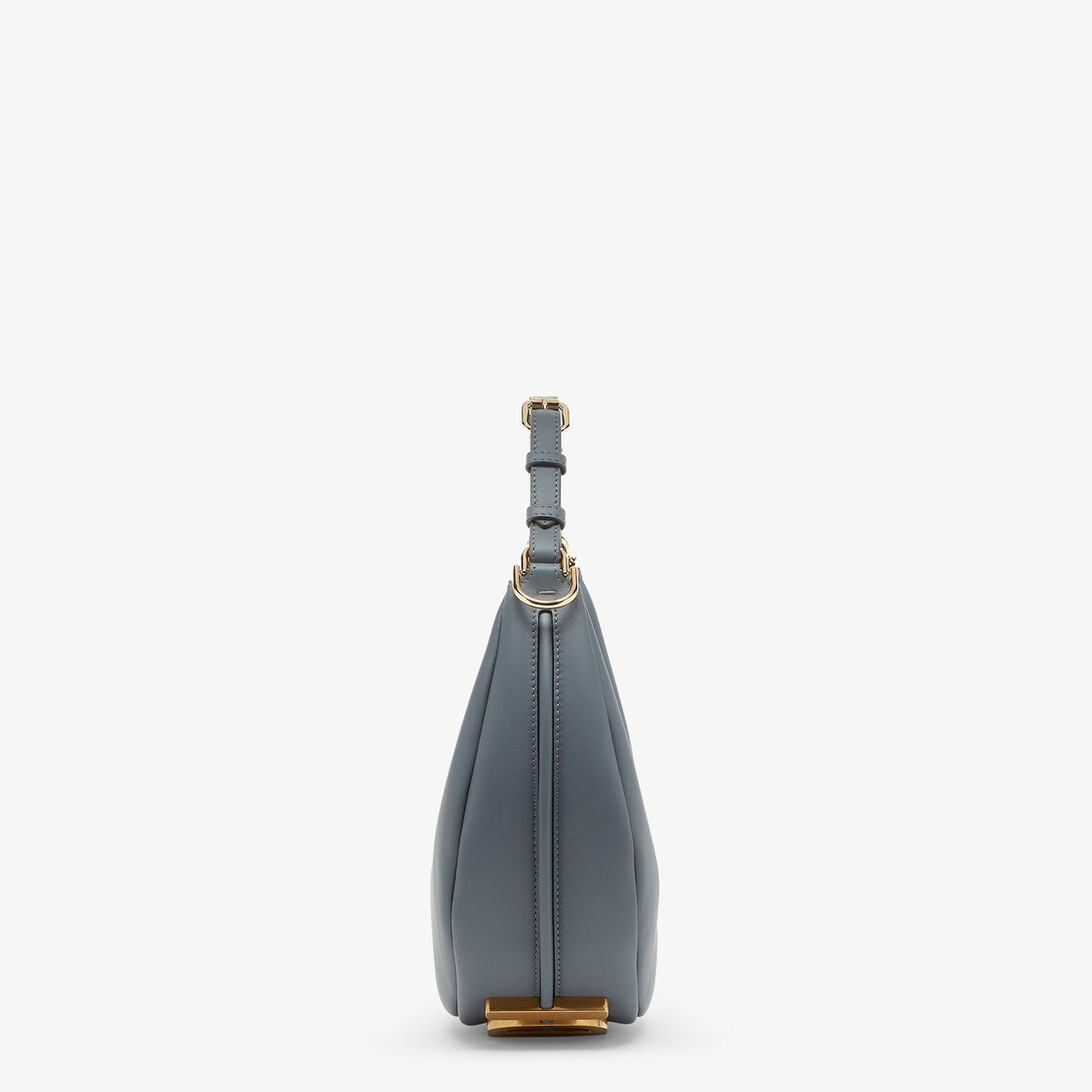 Small hobo bag made of soft, blue leather, decorated with vintage gold metal FENDI lettering visible when wearing the bag under the arm. Zipper closure with fabric-lined internal compartment, gold-finish metalware. Can be worn under the arm or cross-body thanks to the adjustable, detachable handle and the hooks that allow a shoulder strap to be attached.
