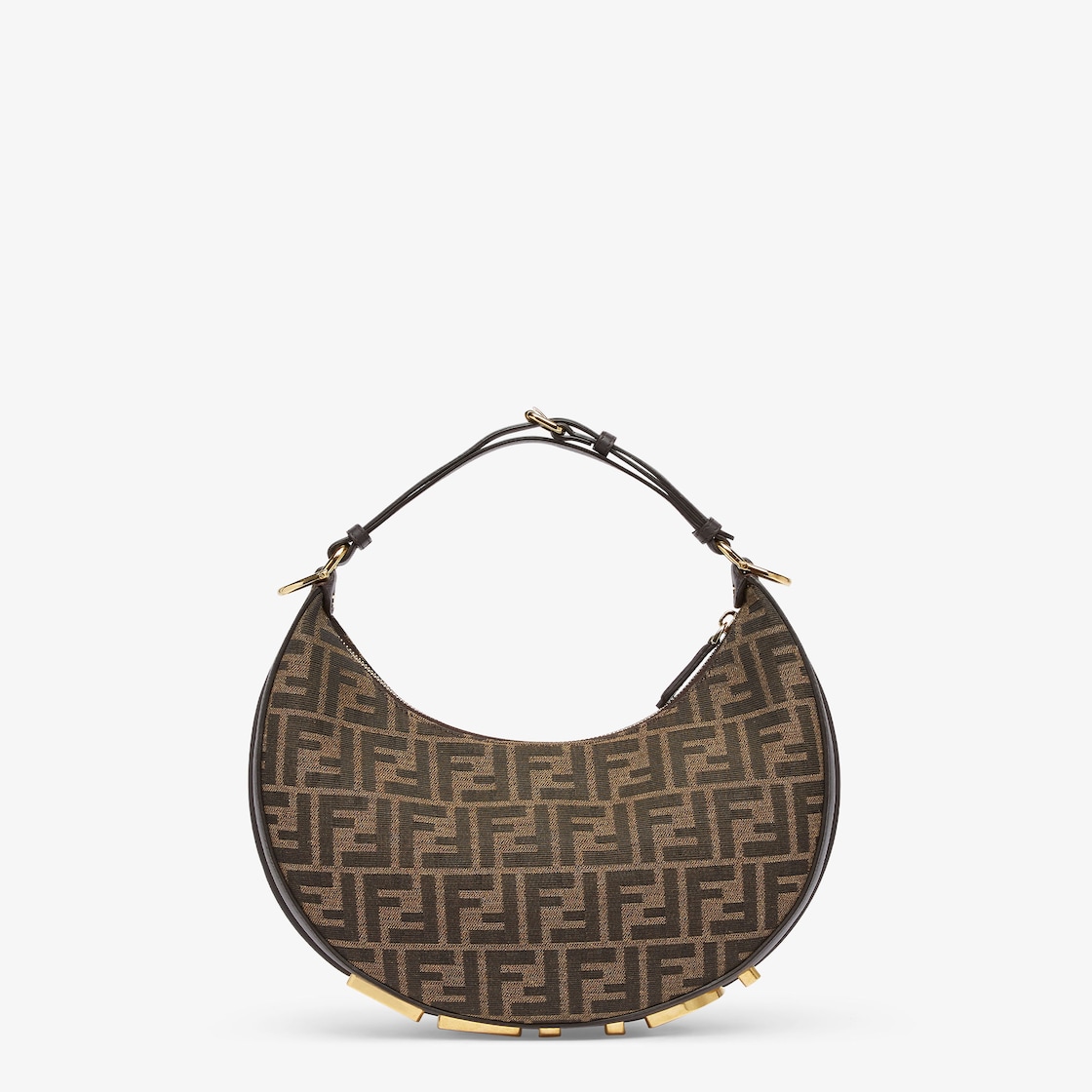 Small Fendigraphy hobo bag with a contemporary look and bold details. Made of jacquard fabric with the iconic FF motif in brown, decorated with vintage gold-finish metal FENDI lettering on the base, visible when wearing the bag under the arm. Zipper closure with fabric-lined internal compartment, gold-finish metalware. Can be worn over the shoulder thanks to the adjustable, detachable handle. Comes with hooks that allow a shoulder strap to be attached for wearing cross-body. Made in Italy