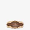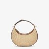 Small Fendigraphy hobo bag with a contemporary look and bold details. Made of natural-coloured macramé, trimmed with brown calfskin, embellished with vintage gold metal FENDI lettering at the bottom, visible when wearing the bag under the arm. Zip closure with an unlined internal compartment, gold-finish metalware. Can be worn over the shoulder thanks to the adjustable, detachable handle. Comes with hooks that allow a shoulder strap to be attached for wearing cross-body.