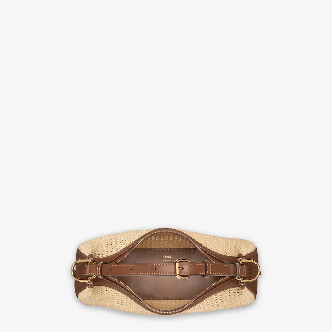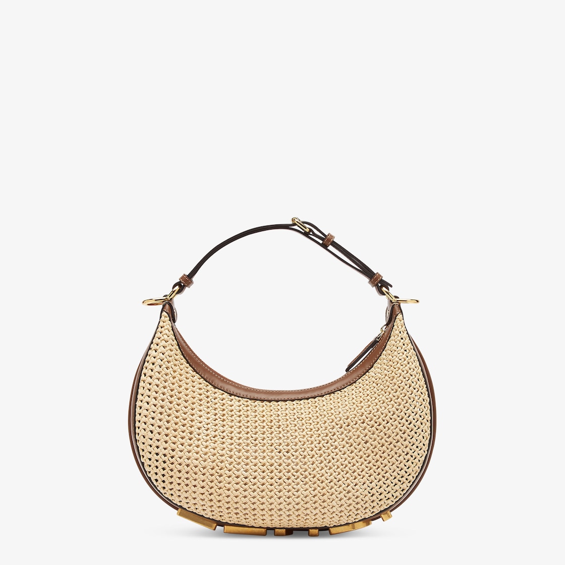 Small Fendigraphy hobo bag with a contemporary look and bold details. Made of natural-coloured macramé, trimmed with brown calfskin, embellished with vintage gold metal FENDI lettering at the bottom, visible when wearing the bag under the arm. Zip closure with an unlined internal compartment, gold-finish metalware. Can be worn over the shoulder thanks to the adjustable, detachable handle. Comes with hooks that allow a shoulder strap to be attached for wearing cross-body.