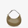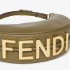 Made of soft green calfskin, decorated with vintage gold-finish metal FENDI lettering on the base, visible when wearing the bag under the arm.