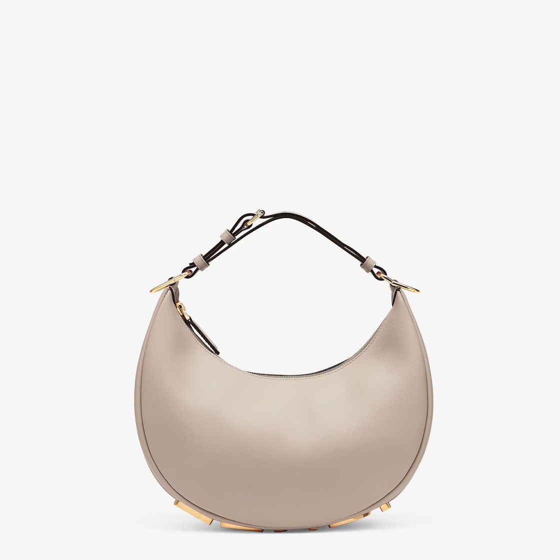 Small Fendigraphy hobo bag with a contemporary look and bold details. Made of soft green calfskin, decorated with vintage gold-finish metal FENDI lettering on the base, visible when wearing the bag under the arm. Zipper closure with fabric-lined internal compartment, gold-finish metalware. Can be worn over the shoulder thanks to the adjustable, detachable handle. Comes with hooks that allow a shoulder strap to be attached for wearing cross-body.