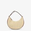 Small hobo bag made of natural-colored straw in a moss-stitch textured weave, with background and details in brown leather. With vintage gold metal FENDI lettering visible when the bag is worn under the arm. Zip closure with fabric-lined internal compartment and vintage gold-finish metalware. Can be worn under the arm or cross-body thanks to the adjustable, detachable handle and the hooks that allow a shoulder strap to be attached.
