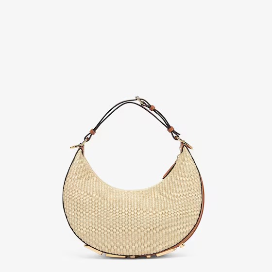 Small hobo bag made of natural-colored straw in a moss-stitch textured weave, with background and details in brown leather. With vintage gold metal FENDI lettering visible when the bag is worn under the arm. Zip closure with fabric-lined internal compartment and vintage gold-finish metalware. Can be worn under the arm or cross-body thanks to the adjustable, detachable handle and the hooks that allow a shoulder strap to be attached.