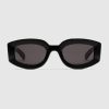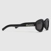 The Pre-Fall 2024 eyewear collection successfully combines the coveted silhouettes of bygone decades with a contemporary logo feel. Here, a black geometric injection frame pairs with a Gucci logo detail.