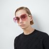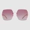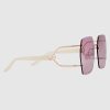 Defined by a frameless construction, these rectangular optical frames recall the lightweight, alternative styles of the 1990s and early 2000s. The shiny rose gold-toned metal temples spotlights cut-out Double G and shiny solid ivory acetate tips.