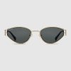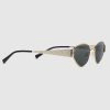 The Cruise 2025 eyewear collection blends an essential silhouette with signature elements. These geometrical sunglasses are accentuated by an allover GG motif on the temples.