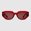 • Shiny transparent red acetate temples with allover GG motif and a Double G detail