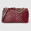 Presenting the House's red hue Gucci Rosso Ancora on the GG Marmont, this small shoulder bag presents the style in a signature color for Pre-Fall, complete with light gold toned hardware and ivory leather lining.