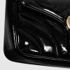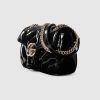 The GG Marmont collection spotlights sophisticated leather in dark tones to welcome Pre-Fall. Crafted in quilted chevron patent leather, this small shoulder bag underlines its contemporary silhouette in black, complete with light gold toned hardware.