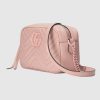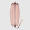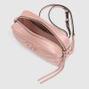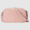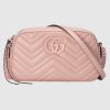 With its recognisable matelassé fabric and Double G hardware, the GG Marmont has become synonymous with the House. Continuously reinvented through the seasons, signature shapes are introduced in new colourways to match Gucci’s contemporary vision. This light pink small shoulder bag reveals a chevron base, further enhancing the tonal logo hardware.
