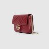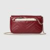 This GG Marmont mini bag is crafted from the new Gucci Rosso Ancora red matelassé chevron leather. The signature Double G hardware in a lighter gold-toned defines the accessory, while a detachable leather card case completes the style in contrasting white leather.