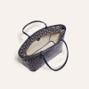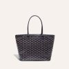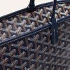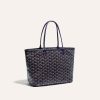 This Goyard Artois PM handbag is crafted in navy blue Goyardine canvas and Chevroches calfskin with palladium tone hardware, white stitching, two flat blue leather handles, zip top closure and one interior floating pocket.