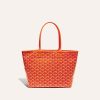 25 cm x 14 cm x 30 cm , 460 g Goyardine Canvas & Chevroches Calfskin Linen and Cotton Inner Side Palladium Zipper leather corners on the bag floating inside pocket Height of handle : 20 cm This Goyard Artois PM handbag is crafted from orange Goyardine canvas and Chevroches calfskin leather with palladium-tone hardware, contrast stitching, two flat orange leather handles, top zip closure and an interior floating pocket. The interior is lined with white canvas and has an interior floating pocket.