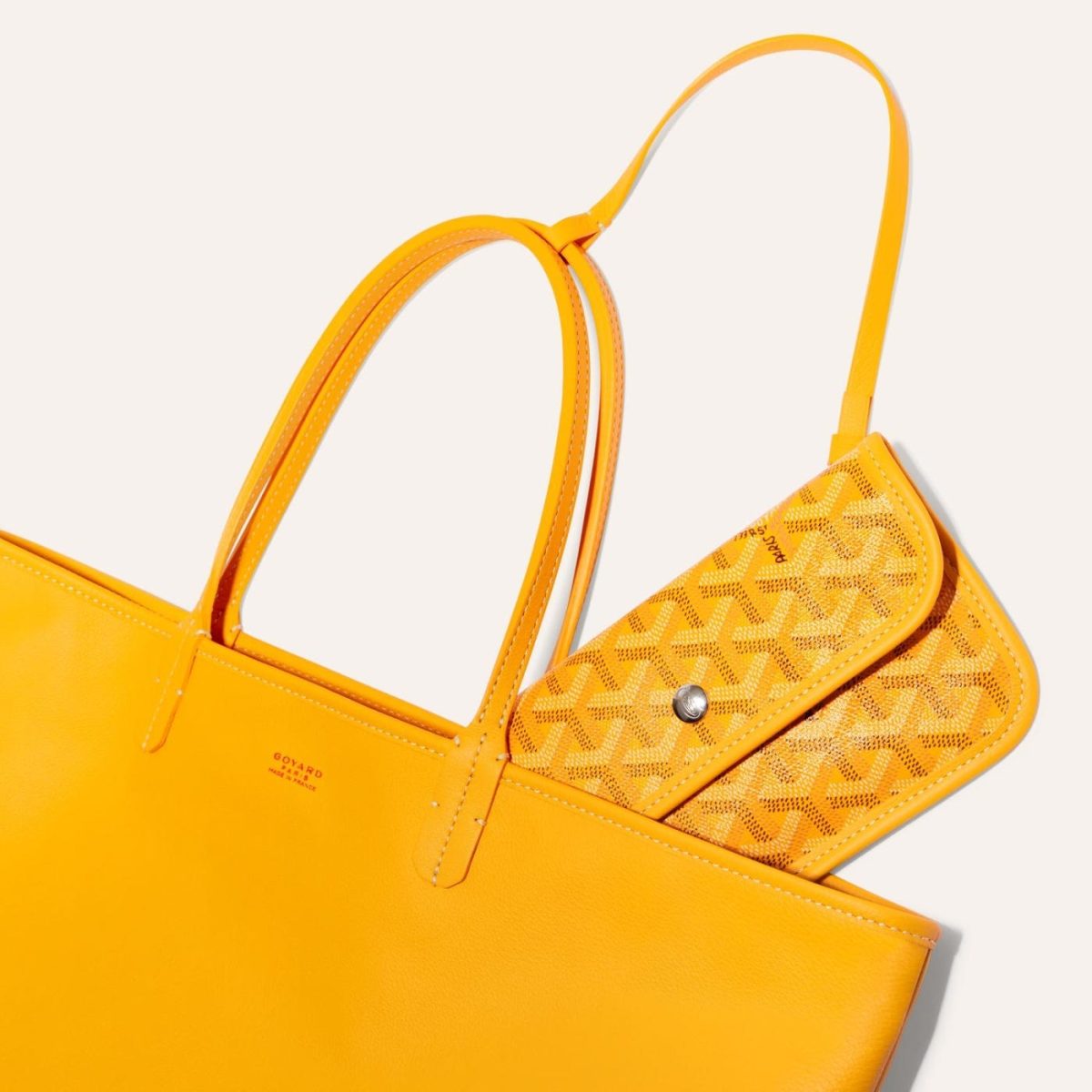 This Goyard yellow Anjou PM bag is made of Goyardine canvas with palladium hardware, contrast stitching, yellow Chevroches calfskin lining and a removable yellow coin purse.