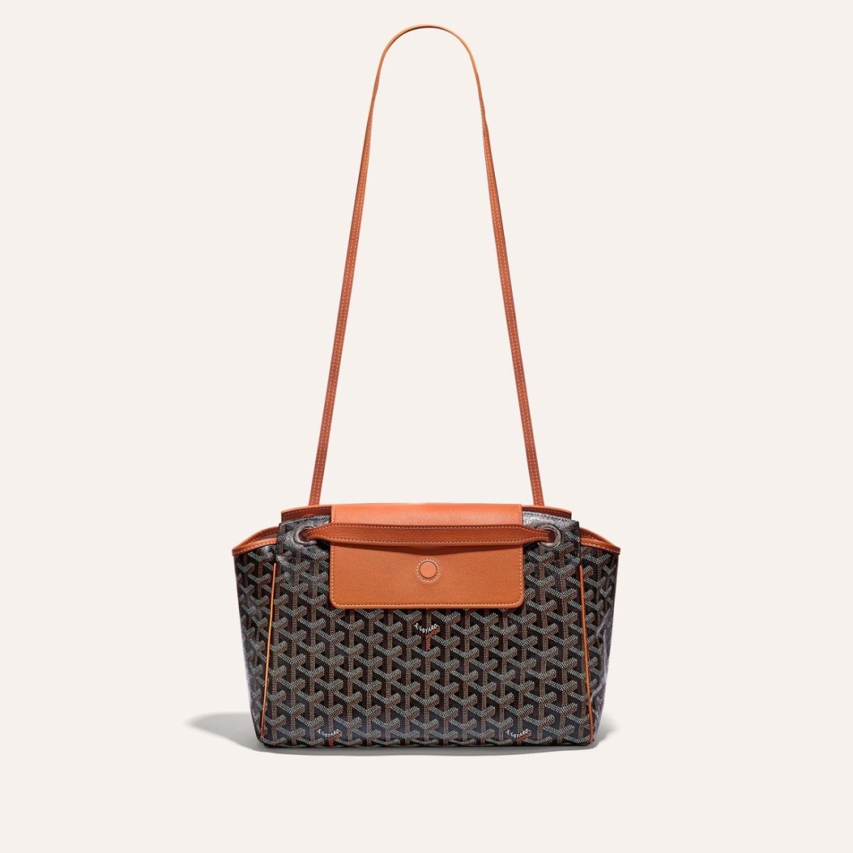 31 cm x 14 cm x 23 cm , 0.67 kg Goyardine Canvas & Chevroches Calfskin Linen and Cotton Inner Side Palladium Magnetic flap 2 leather shoulder pads, 2 protective leather bottom straps floating inside pocket The Rouette souple bag is Maison Goyard’s expression of the very essence of modularity as there are 22 different ways of wearing it thanks to its sliding strap, gussets and magnetic leather flap. It will go with every mood and every style and can change and transform throughout the day.