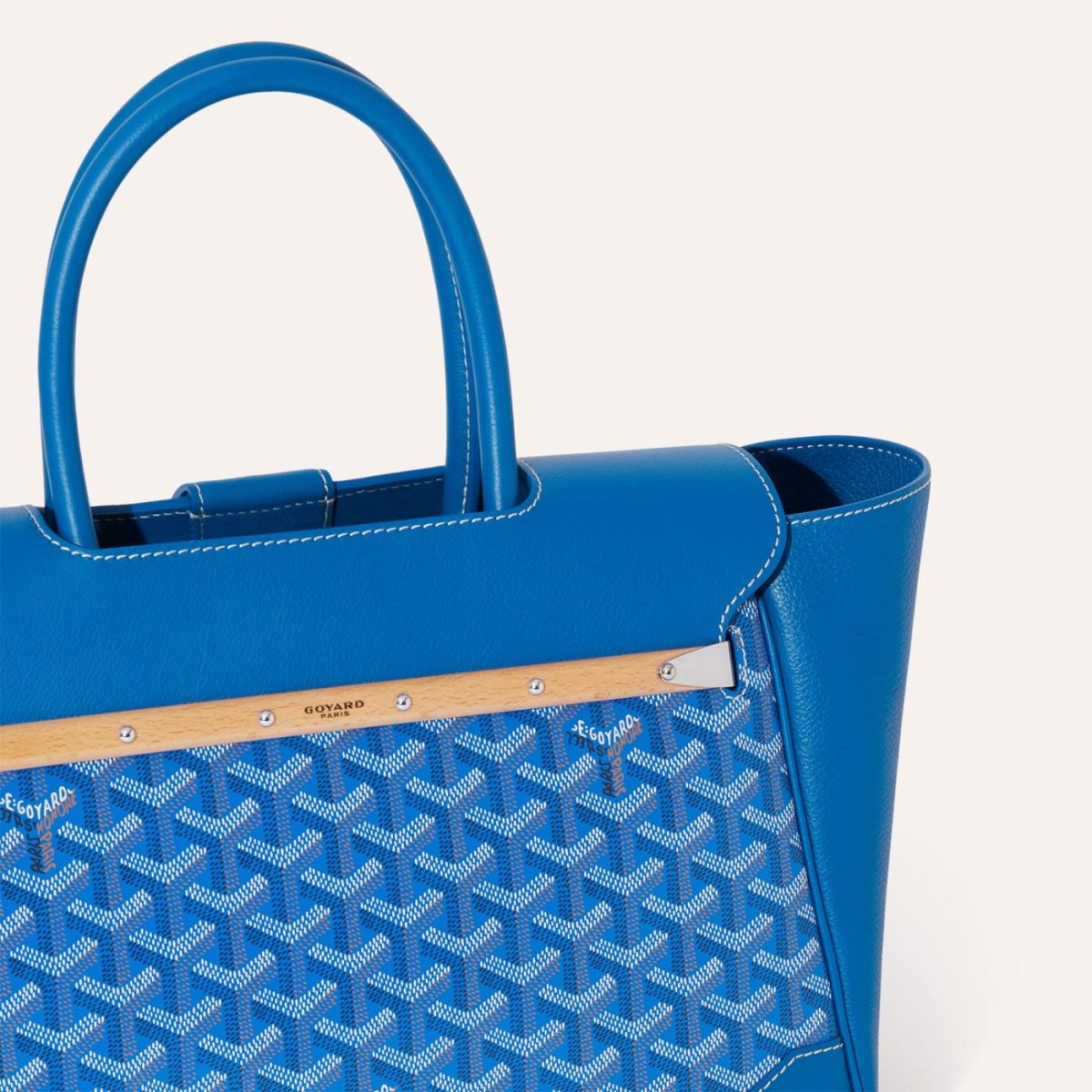 This Goyard Saigon soft tote is in blue Goyardine coated canvas and chevroches calfskin with palladium hardware, contrast stitching, features two double rolled top handles, signature Saigon leather strap and loop closure, and a cutout in the top of the flap for the handle to fit through.