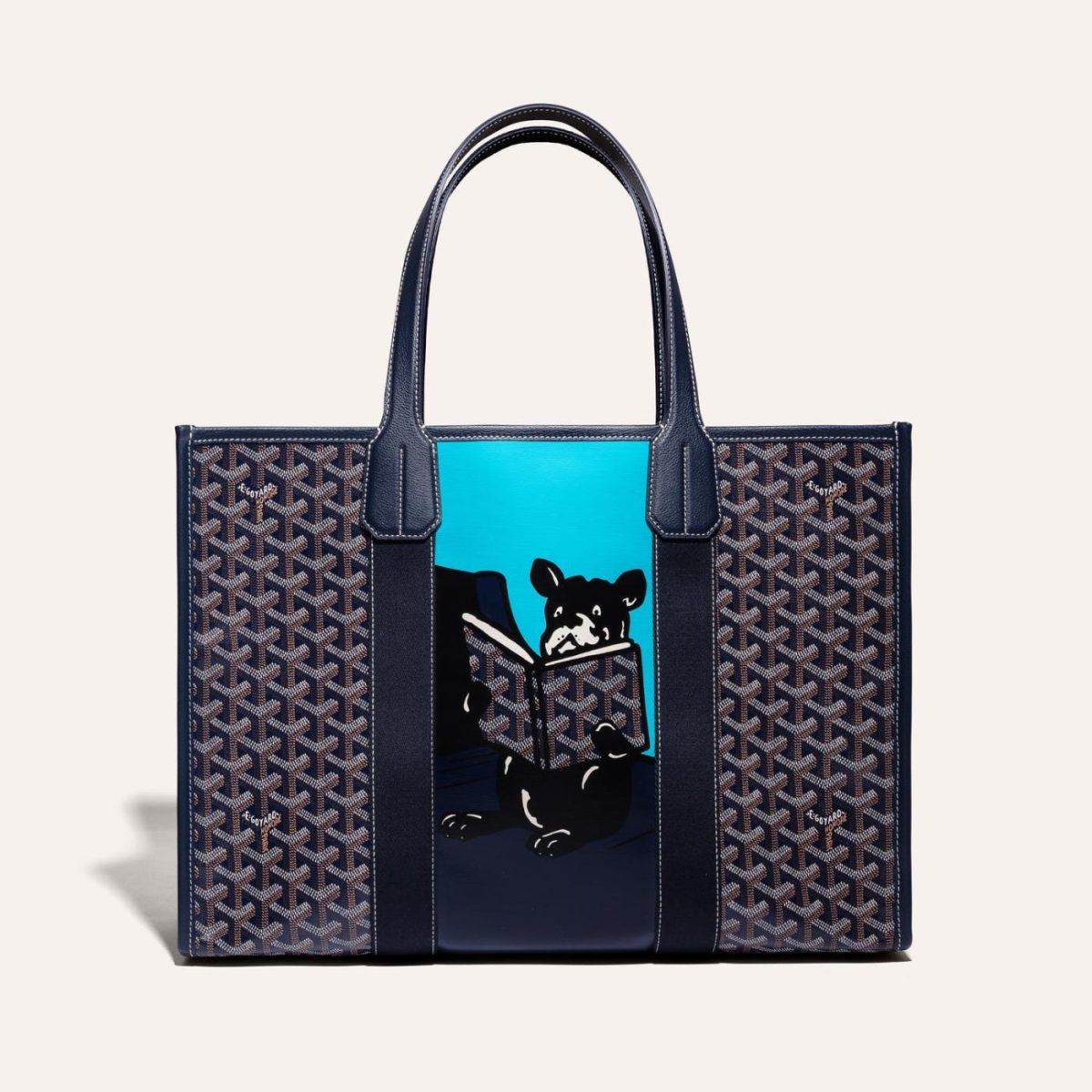 32 cm x 15 cm x 45 cm , 0.655 kg Goyardine Canvas & Chevroches Calfskin Linen and Cotton Inner Side None Hulot screenprint on the front Height of handle : 23 cm