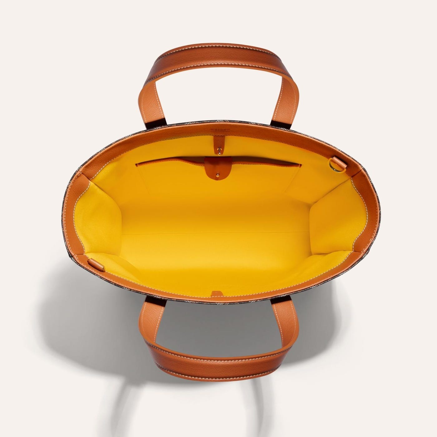 38 cm x 11.5 cm x 38.5 cm , 1.085 kg Goyardine Canvas & Chevroches Calfskin Yellow Cotton Lining Palladium 2 protective leather bottom straps inside flat pocket Height of handle : 12 cm The Voltaire bag boasts a large size and streamlined style that gives it an urban, modern look. It can be used with casual outfits or in a more formal style for work, thanks to its large volume inside. An additional MM strap can be used to wear it in different ways.