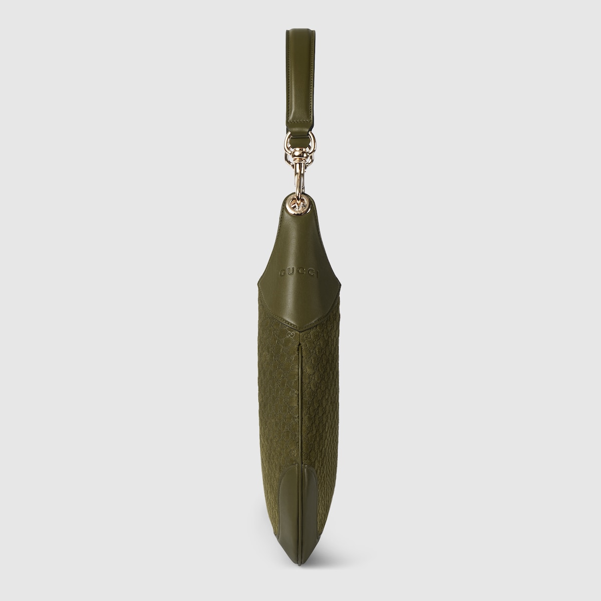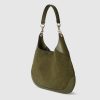 Introducing the Gucci B, which draws inspiration from a 1950s archival style. This shoulder bag, embodying the essence of its mid-20th century design origins, is crafted from soft suede and has an additional shoulder strap for crossbody wear.