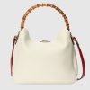 Combining recognizable elements of the House, the medium-sized shoulder bag is defined by its bamboo handles and Double G hardware. Crafted from white leather, the accessory is further accentuated a contrasting red leather shoulder strap.
