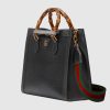 First used in the post-war era when traditional materials were hard to come by, bamboo has become not only a symbol of the spirit of reinvention that runs throughout the House’s designs but one of Gucci’s most recognizable signatures. The Gucci Diana embodies this idea, representing the notion of style in constant evolution with its removable leather belts—a nod to the functional bands used to keep the handles in shape. Here, the bag is presented in black leather.