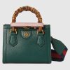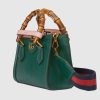 An evolution of a bamboo handle tote first introduced in 1991, the Gucci Diana represents the notion of style in constant evolution and is reimagined with removable, neon leather belts—a nod to the functional bands used to keep the handles in shape. Here, a mini version of the emblematic style is presented in green leather.