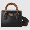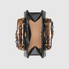 An evolution of a bamboo handle tote first introduced in 1991, the Gucci Diana represents the notion of style in constant evolution and is reimagined with removable, neon leather belts—a nod to the functional bands used to keep the handles in shape. Here, a mini version of the emblematic style is presented in black leather.