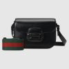 With the same lines and forms first introduced over six decades ago, the Gucci Horsebit 1955 shoulder bag unifies the original details with a modern spirit. The Horsebit, part of Gucci’s genetic code, has been established as one of the most distinctive elements among the House symbols borrowed from the equestrian world. Presented on a small flap shoulder bag, the monotone hardware is paired with black leather and the bag is enriched with two detachable shoulder straps, one is crafted in emblematic green and red Web the other is in leather.