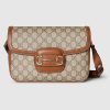 The Gucci Horsebit 1955 continues its equestrian-inspired design with the double ring and bar hardware, blending light gold-toned details and GG Monogram coated fabric, with a soft and sophisticated feel, on this shoulder bag.