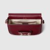 The Gucci Horsebit 1955 Soft continues to highlight its signature double ring and bar hardware. This mini shoulder bag style is crafted from Gucci Rosso Ancora red soft leather with natural shine.