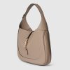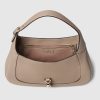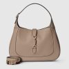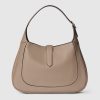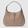 In the Fall Winter 2024 collection, the Gucci Jackie 1961 shoulder bag with new light gold-toned piston closure features fine taupe leather, highlighting the craftsmanship, crescent shape, and sleek silhouette of the House’s iconic handbag. This medium size comes with a green and red Web strap for different styling options.