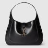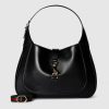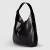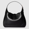 In the Spring Summer 2024 collection, the Gucci Jackie shoulder bag features premium fine leather which highlights the craftsmanship, crescent shape, and sleek silhouette of the House’s iconic shoulder bag. Light gold-toned hook closure, leather trim, and an additional green and red Web strap gives this Gucci Jackie medium shoulder bag in black leather further styling options.