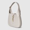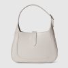 The new Gucci Jackie is crafted from premium fine leather which highlights the craftsmanship, crescent shape, and sleek silhouette of the House's emblematic shoulder bag. Light gold-toned hook closure, leather trim, and an additional Web strap gives this Gucci Jackie small shoulder bag in light grey leather further styling options.