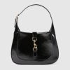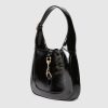 The new Gucci Jackie is crafted from fine leather which highlights the craftsmanship, crescent shape, and sleek silhouette of the House's iconic shoulder bag. Light gold-toned hook closure, leather trim, and an additional strap featuring the green and red Web gives this Gucci Jackie small shoulder bag in black patent leather further styling options.