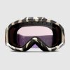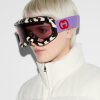 A ski mask fit for glossy mountain peaks, with sporty details and technical features. Here the black and ivory striped frame is decorated with the name of the House, while a lilac and red strap appears at the back. A solid bordeaux lens completes this style.