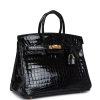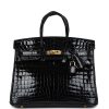 This Birkin is in Black shiny Niloticus crocodile leather with gold hardware and has tonal stitching, front strap, two straps with center toggle closure, clochette with lock and two keys and double rolled handles.