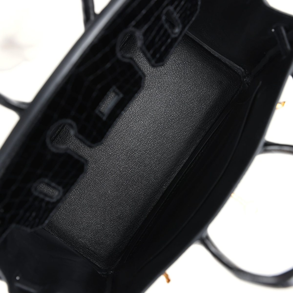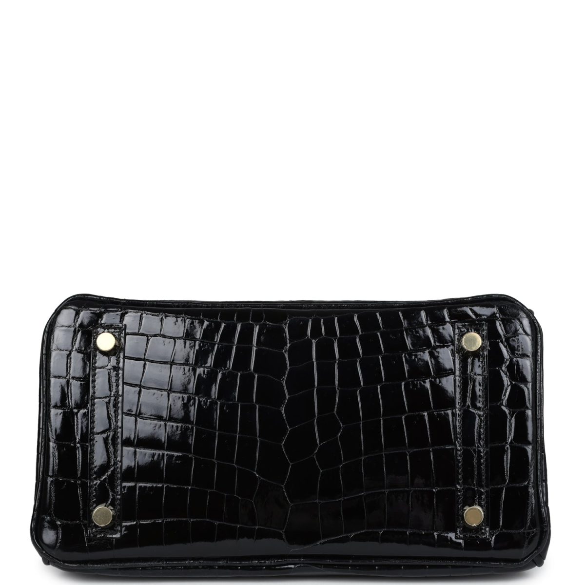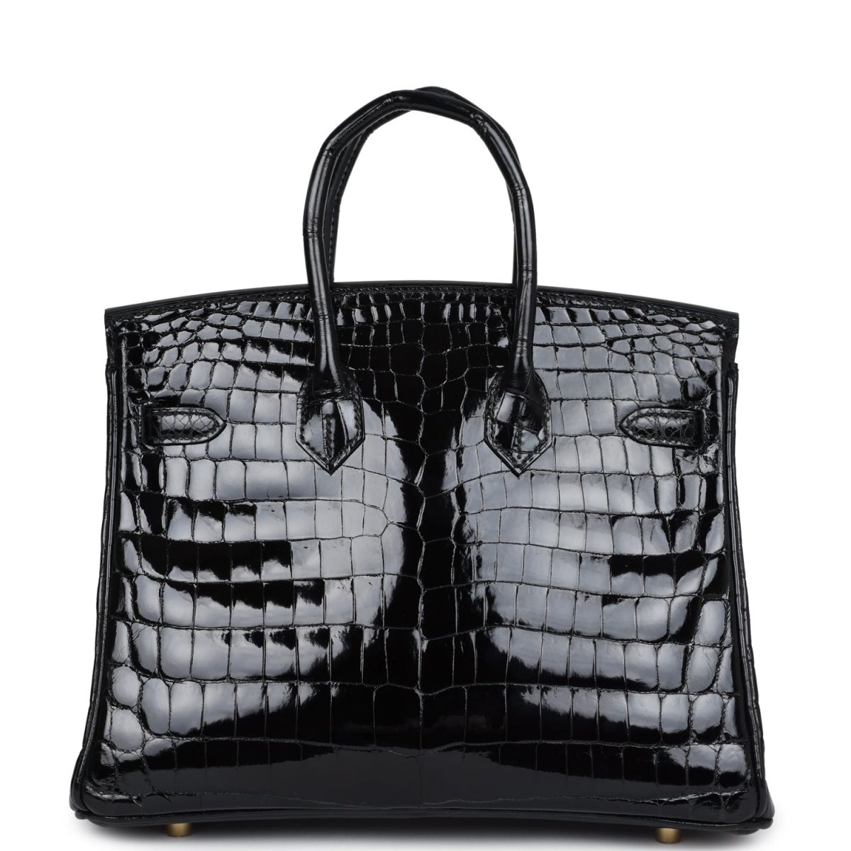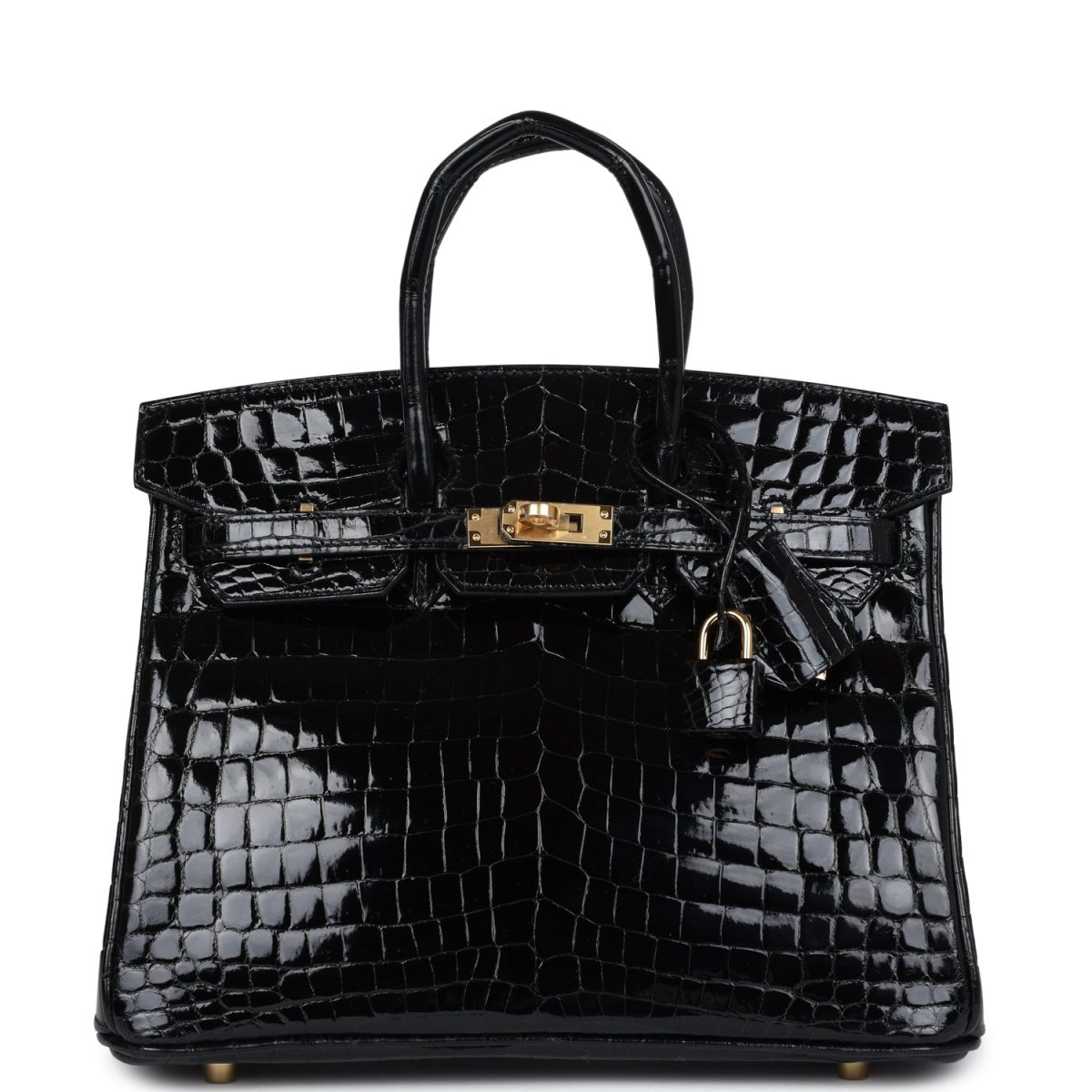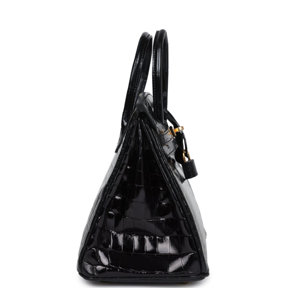 This Birkin is in Black shiny Niloticus crocodile leather with gold hardware and has tonal stitching, front strap, two straps with center toggle closure, clochette with lock and two keys and double rolled handles.